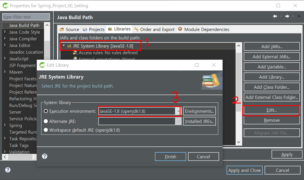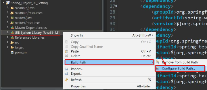 - JRE System Libaray 우클릭 > Build Path > configure build path > JRE System Library > 1.8 ver