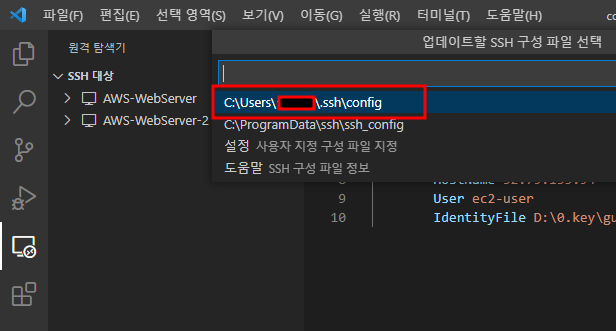 경로 : 사용자 홈 디렉토리\.ssh\config ( 예: C:\Users\admin\.ssh\config )