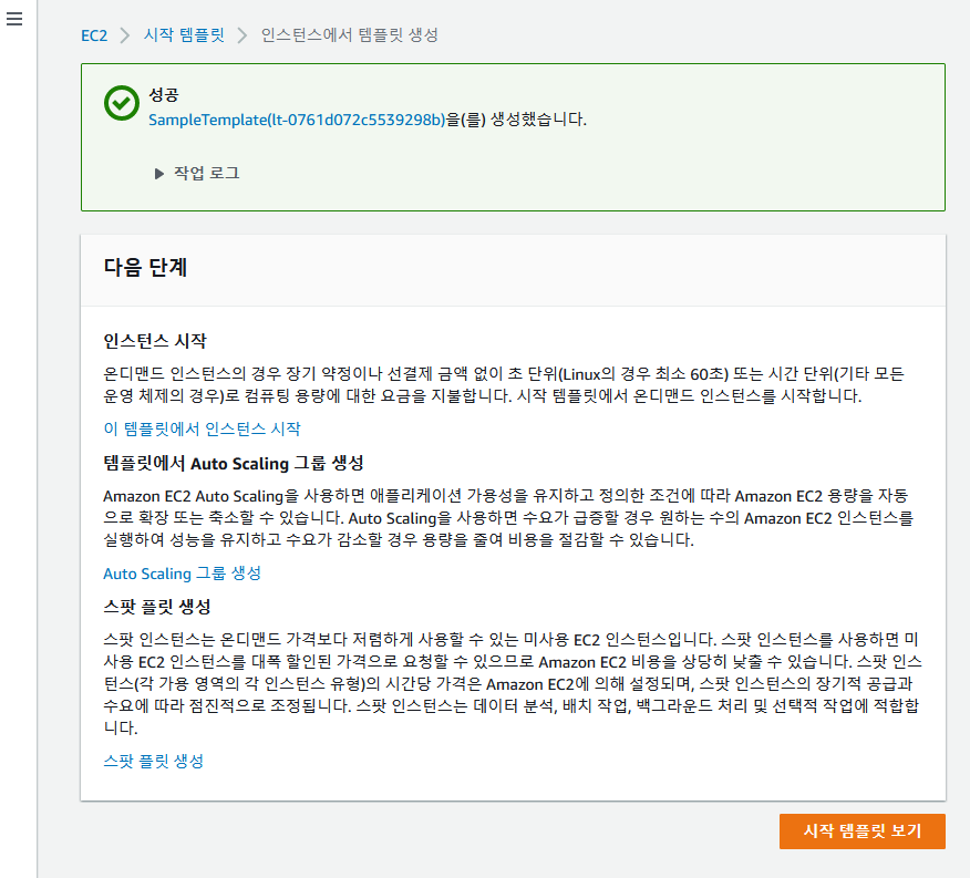8. 모든 설정이 완료되면 시작 템플릿을 생성합니다. 위 사진이 나오면 템플릿이 잘 만들어진것 입니다.
