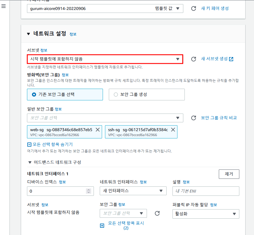 5. 네트워크 설정의 서브넷 항목을 시작 템플릿에 포함하지 않음으로 변경한다.
