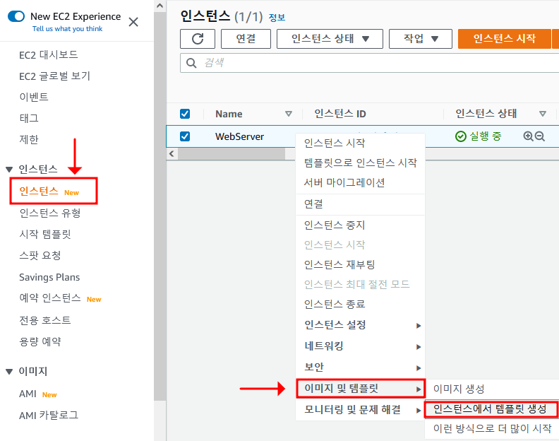 1. EC2 메뉴 -> 인스턴스에서 이미지를 생성할 EC instance 선택 후, 우클릭 -> 이미지 및 템플릿 -> 인스턴스에서 템플릿 생성