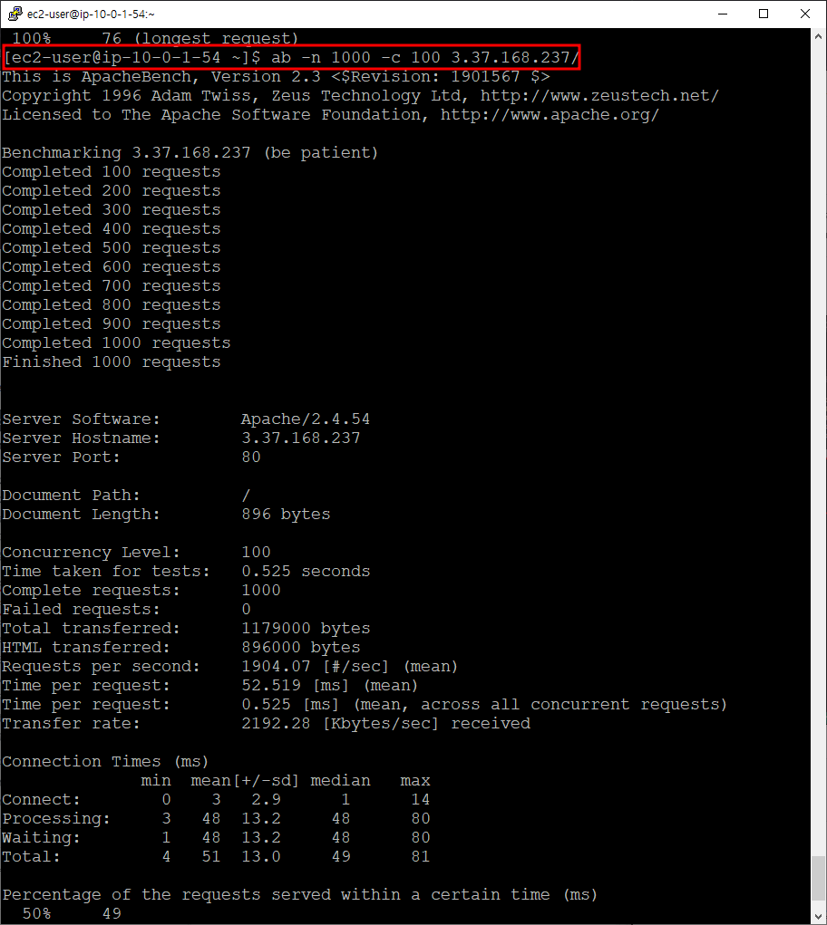 - Apache 제공 Apache Bench (부하 발생기)를 이용하여 Web Server에 대한 부하 테스트를 수행하고 Web Server에 대한 Scale up 필요성 확인 및 Scale up 수행