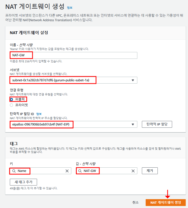VPC 메뉴 -> NAT 게이트웨이에서 NAT 게이트웨이 생성 클릭