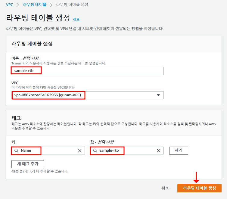 VPC 메뉴 -> 라우팅 테이블에서 라우팅 테이블 생성 클릭