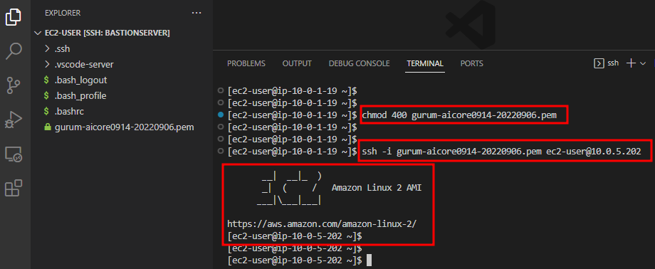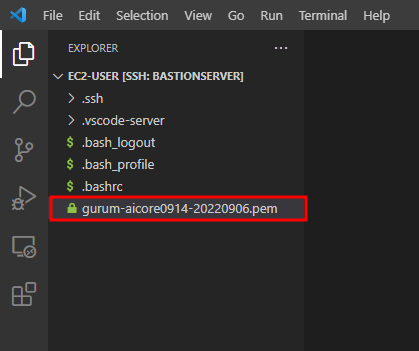 visual studio code에서 bastion server에 연결 -> bastion server 홈 디렉토리에 키 파일을 드래그 앤 드롭으로 가져오기
