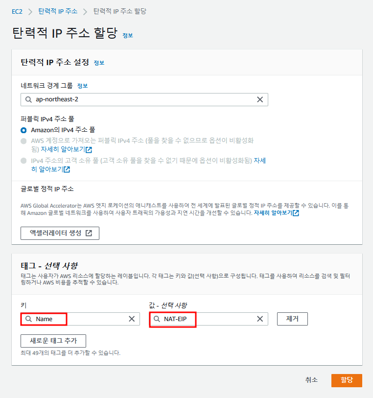 EC2 메뉴 -> 탄력적 IP에서 탄력적 IP 주소 할당 클릭 -> 태그 설정 -> 할당