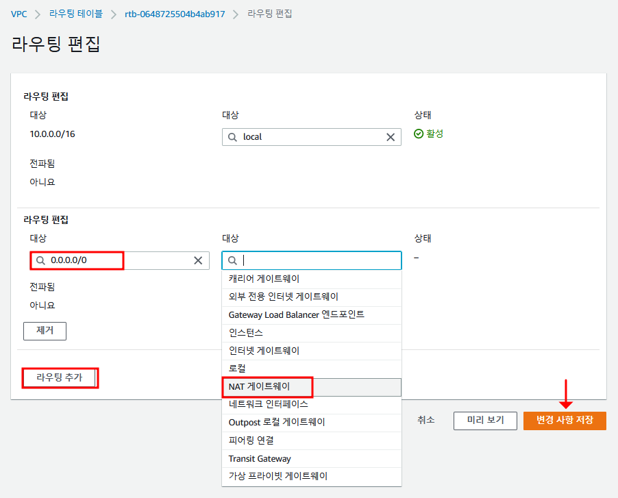 - 두번째 대상: NAT 게이트웨이 -> 새로 생성한 NAT게이트웨이 선택