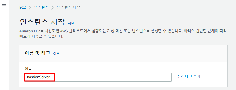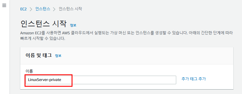 EC2 메뉴 -> 인스턴스에서 인스턴스 시작 클릭 -> 이름 및 태그, 키페어, 네트워크 설정