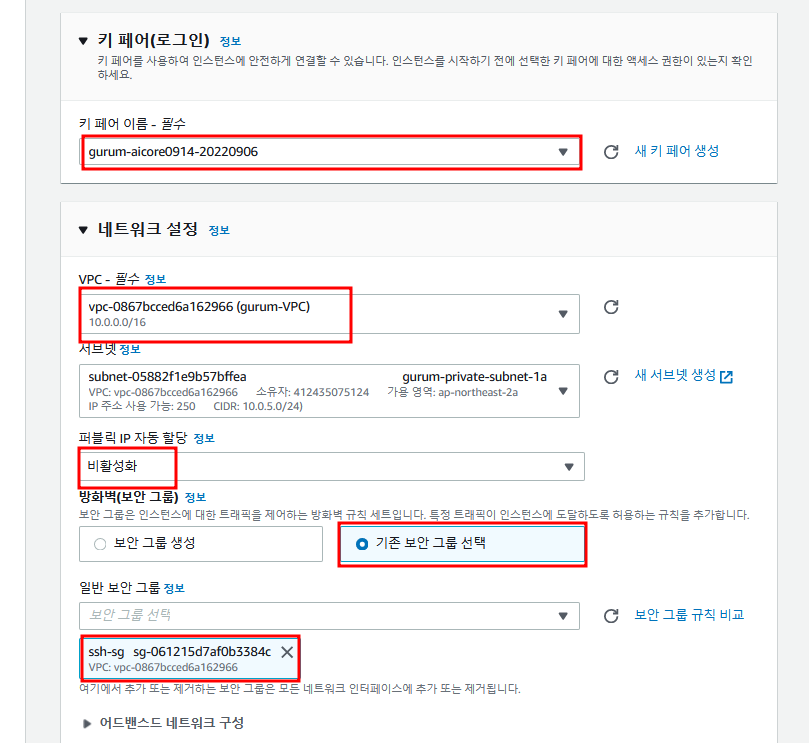 - 방화벽: 기존 보안 그룹 선택 -> ssh (22번포트)