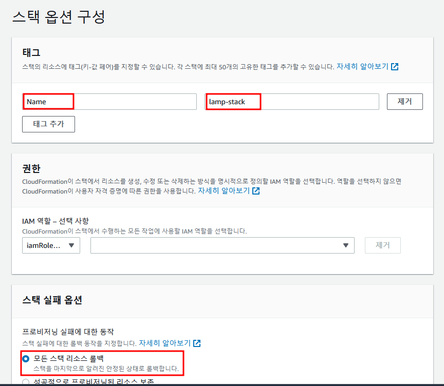 - 스택 실패 옵션 : 모든 스택 리소스 롤백