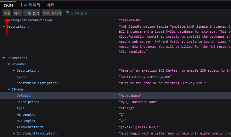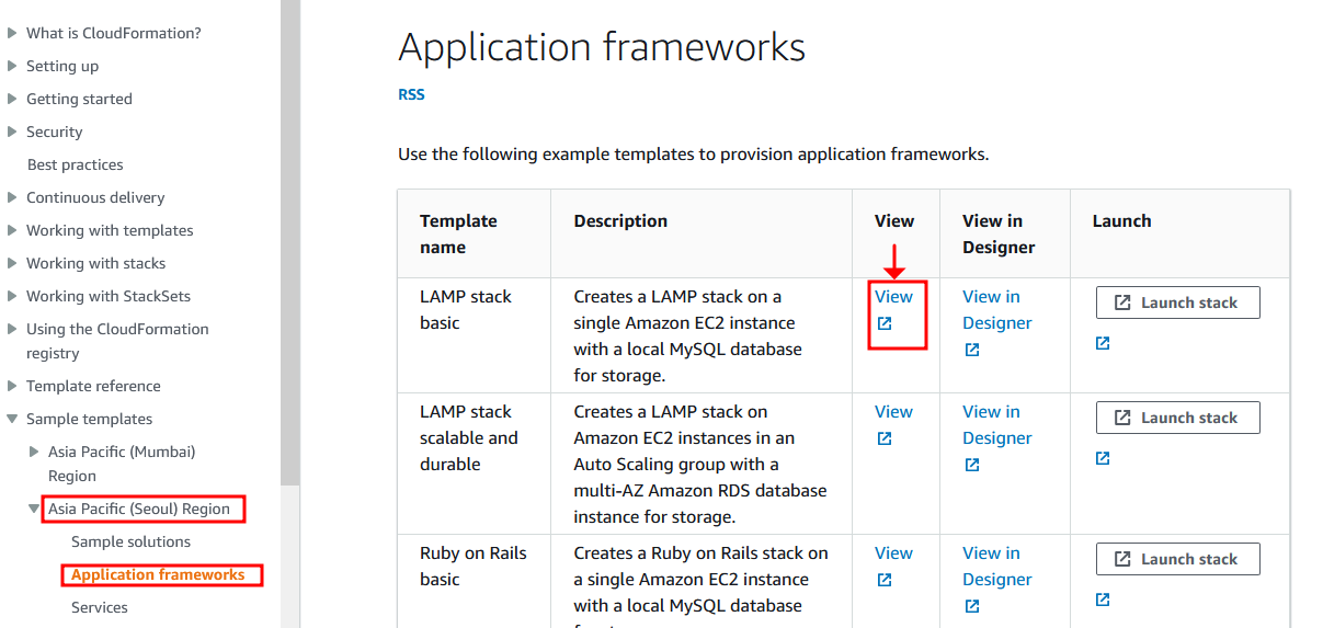 AWS 홈페이지 -> Documentation> AWS CloudFormation > User Guide -> Sample templates에서 Asia Pacific (Seoul) Region> Application frameworks -> LAMP stack basic 의 View 클릭 후 JSON 저장