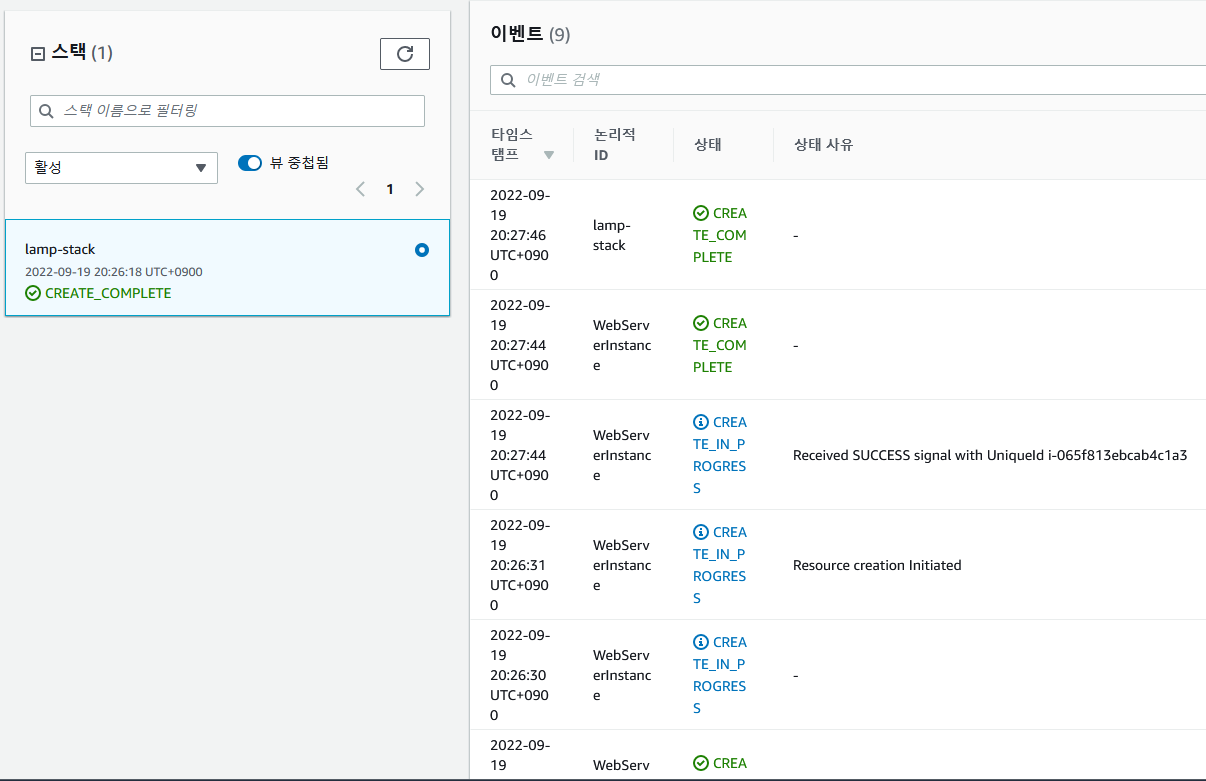 스택 옵션 구성 설정 후, 스택 생성 -> 스택이 정상적으로 생성되었는지 스텍의 이벤트 확인