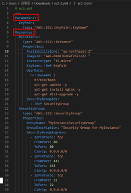 - JSON 또는 YAML 포맷으로 AWS CloudFormation 템플릿 작성 - 구성하려하는 AWS 리소스에대한 정보 기술