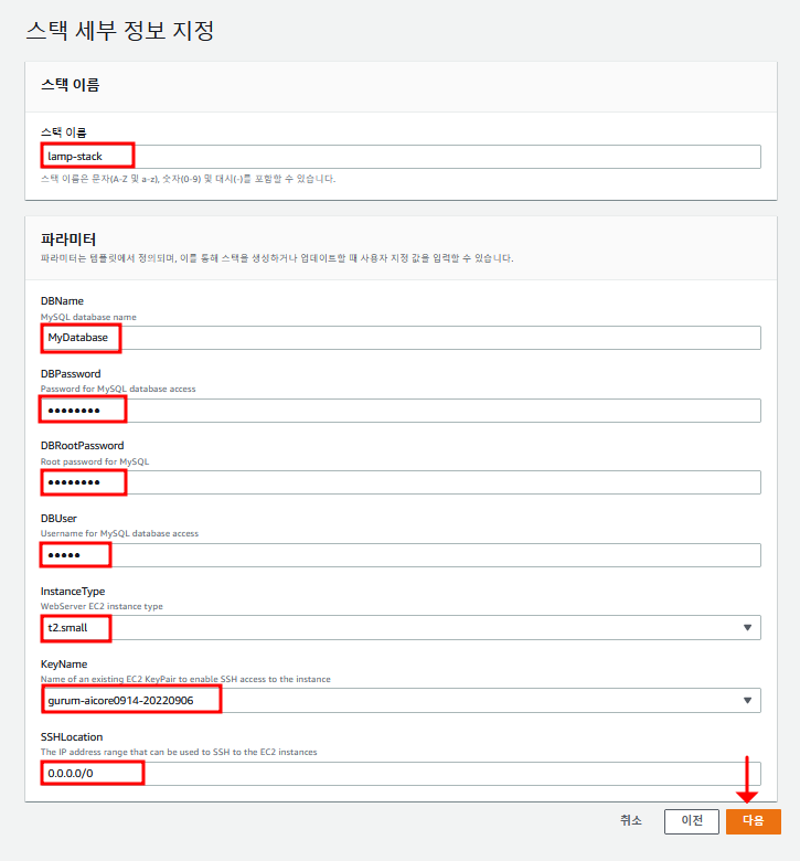 CloudFormation 메뉴 -> 스택에서 스택 생성(새 리소스 사용 선택) -> 스택 생성, 스택 세부 정보 지정
