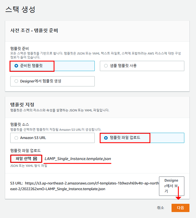 - 템플릿 위치를 지정하여 AWS CloudFormation 스택 생성