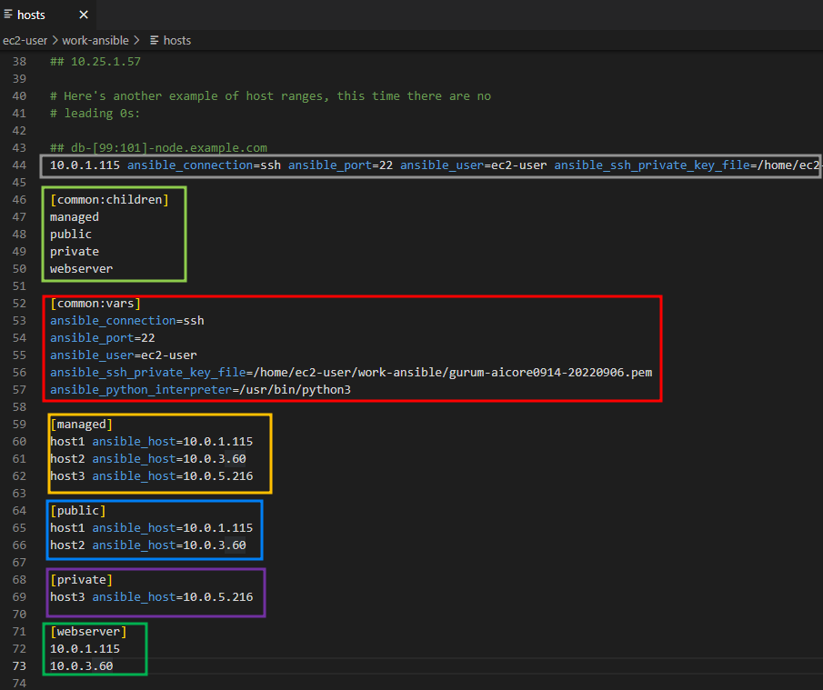 - 공통정보를 변수에 저장하여 공유하는 방식 (빨간색 박스 표시) : [그룹명:vars] , <host name>[속성]