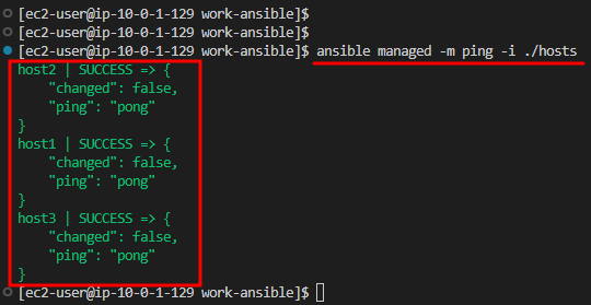 ansible managed -m ping -i ./hosts- managed 호스트 패턴에 대하여 ping 모듈 적용, 인벤토리는 현재 디렉토리의 hosts 사용