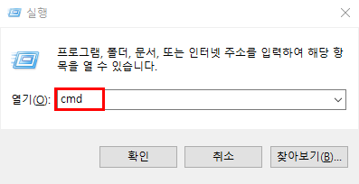 윈도 키 + r을 눌러 실행창을 띄우고 , cmd를 입력하고 확인 버튼 클릭!