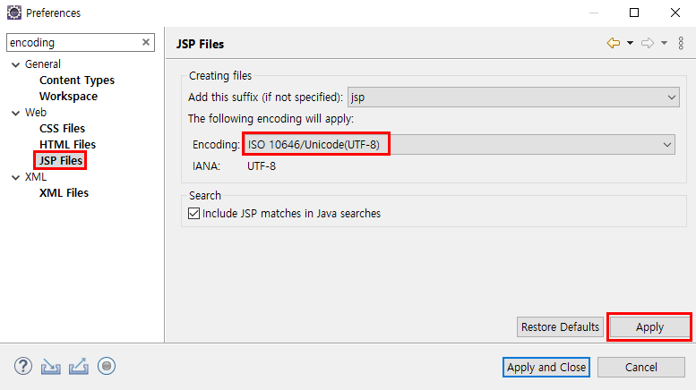 Web > JSP Files 또한 UTF-8로 설정합니다.