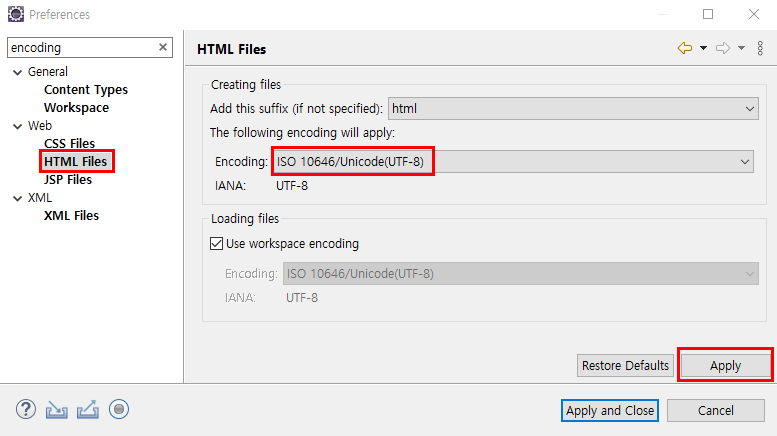 Web > HTML Files에서도 UTF-8로 설정합니다.