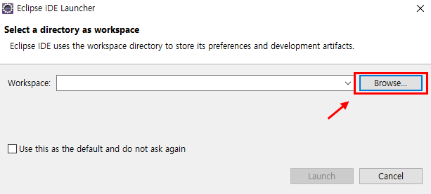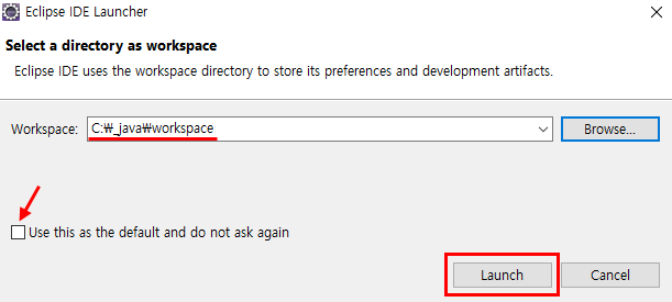 워크스페이스의 경로를 계속 사용하기 때문에 왼쪽 박스를 체크 후 Launch 버튼을 클릭합니다.