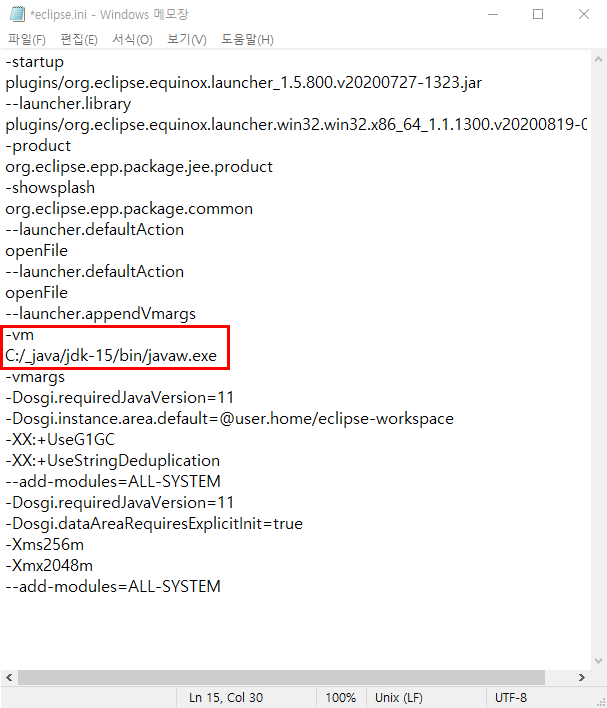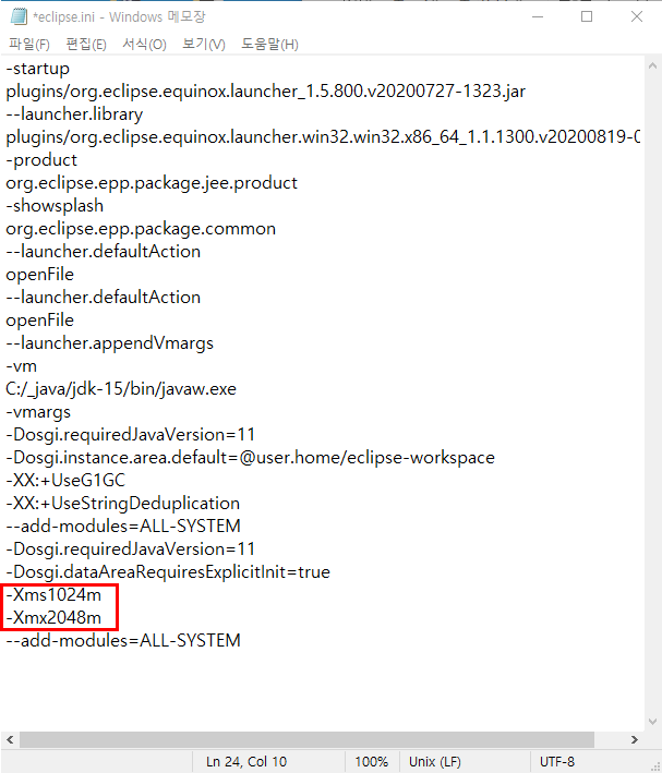 이클립스 를 종료하고, eclipseeclipse.ini 파일을 엽니다.