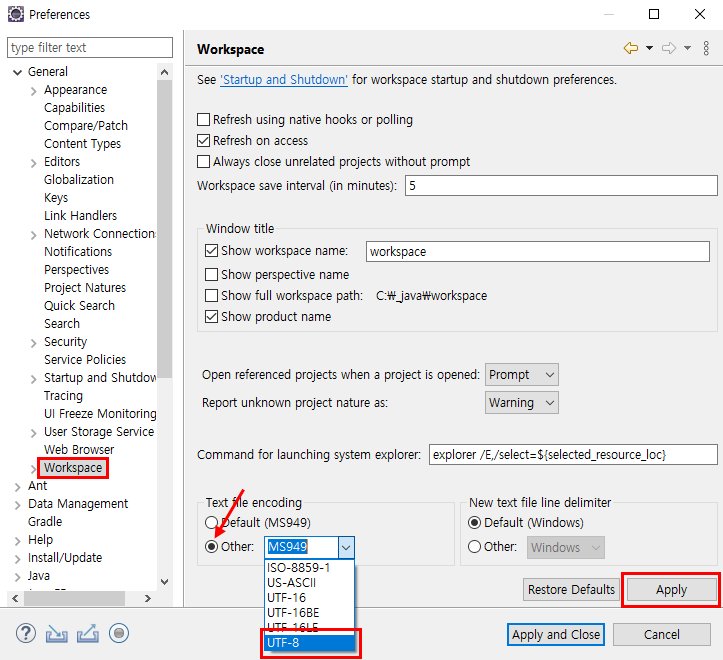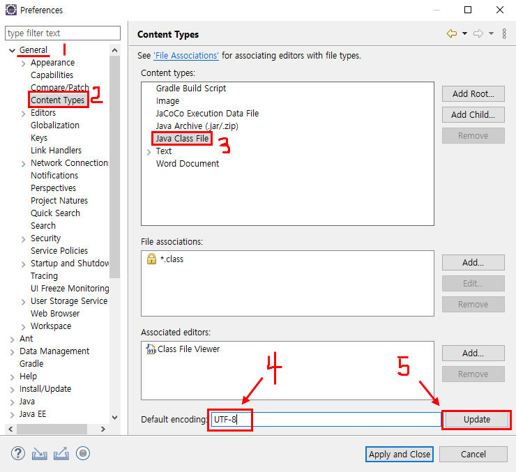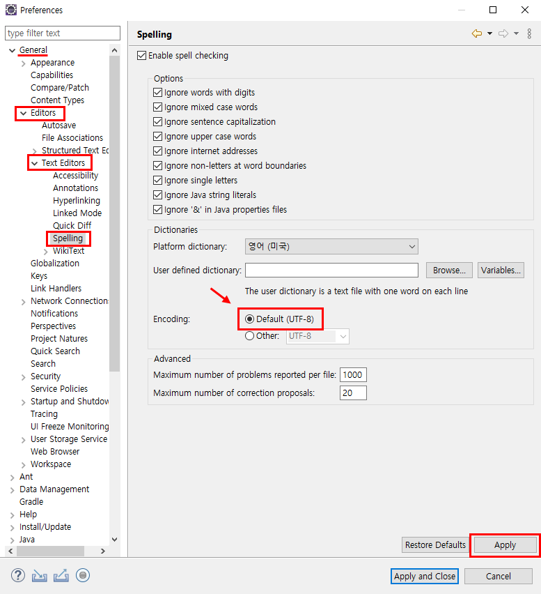 Default encoding에 UTF-8을 입력 후 Upate 버튼을 누릅니다.