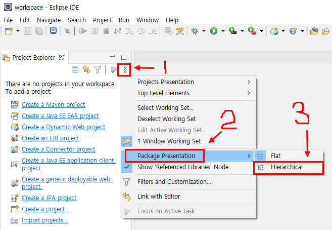 이클립스 화면 구성을 자신에게 편리한 모양으로 구성합니다.