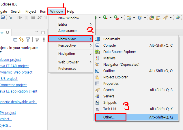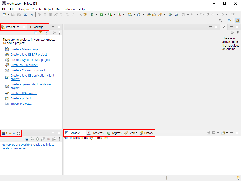Markers, Properties, Data Source Explorer, Snippets 뷰는 잘 쓰지 않기 때문에