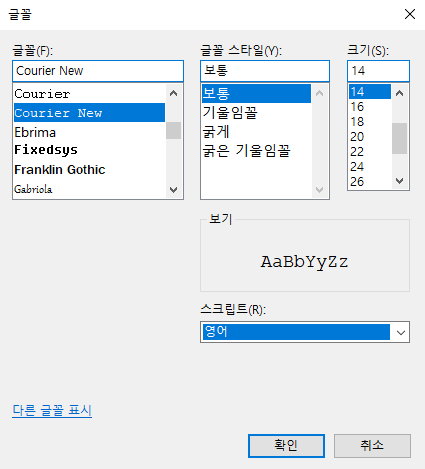 저는 Courier 글꼴과 14크기가 적당합니다.
