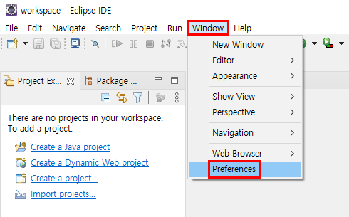 Window > Perspective > Customize Perspective... 를 클릭합니다.