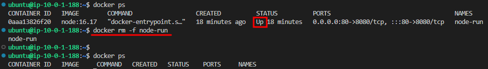 # 실행중인 container를 강제로 삭제하려면 f 옵션을 사용한다.