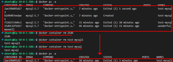 docker container rm 25d6 docker container rm test-mysql1 docker container rm test-mysql # docker container rm <container ID 또는 NAMES>