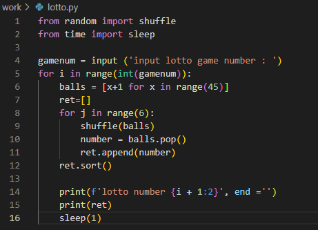(1) 어플리케이션으로 사용할 python파일 생성from random import shuffle from time import sleep gamenum = input ('input lotto game number : ') for i in range(int(gamenum)): balls = [x+1 for x in range(45)] ret=[] for j in range(6): shuffle(balls) number = balls.pop() ret.append(number) ret.sort() print(f'lotto number {i + 1:2}', end ='') print(ret) sleep(1)