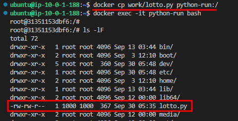 # docker cp 명령으로 work/lotto.py 파일을 container의 루트 디렉토리에 복사한다.