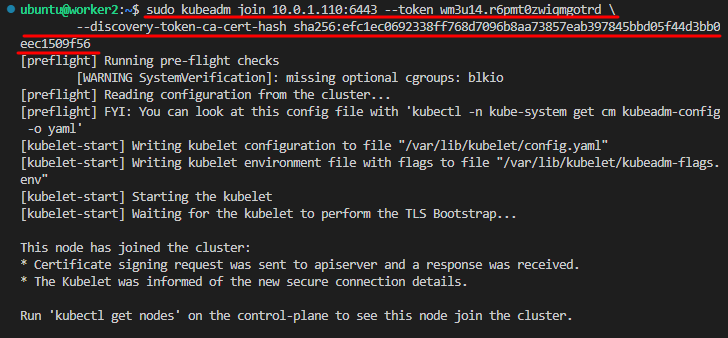 sudo kubeadm join 10.0.1.110:6443 --token wm3u14.r6pmt0zwiqmgotrd \ --discovery-token-ca-cert-hash sha256:efc1ec0692338ff768d7096b8aa73857eab397845bbd05f44d3bb0eec1509f56- kubeadm init 으로 확인한 토큰 정보를 worker node에 작성한다.