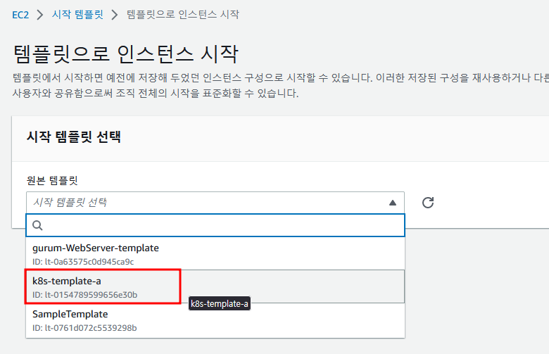 - 인스턴스 > 인스턴스, 인스턴스 시작 에서 템플릿으로 인스턴스 시작 실행
