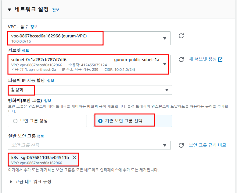 # 3. 네트워크 설정 - 기존 VPC 선택, 퍼블릭 IP 자동할당, 모든 트래픽 허용 보안그룹 선택