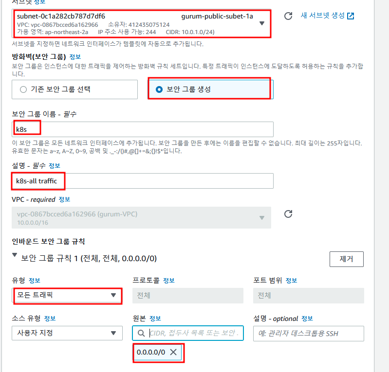 # 4. 서브넷은 기존 서브넷 사용, 연습용으로 모든 트래픽을 허용하는 보안그룹 생성