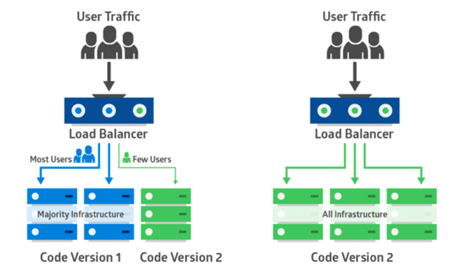 전환하기 때문에 부정적 영향을 최소화하고 트래픽 양을 조절하여 Rollback할 수 있다.- A/B 테스트, 대조군과 실험군을 나누어 특정 UI나 Algorithm 효과 비교 테스트를 할 수 있다.